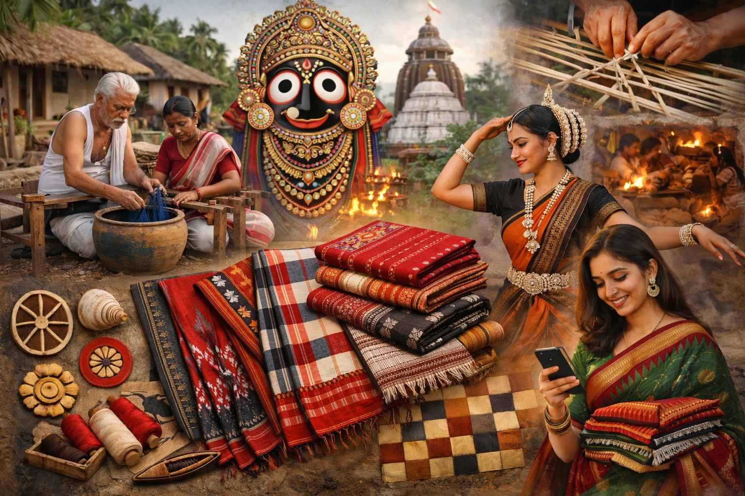 This Dolabedi Sambalpuri saree celebrates Odisha’s sacred temple traditions through classic ikat art..