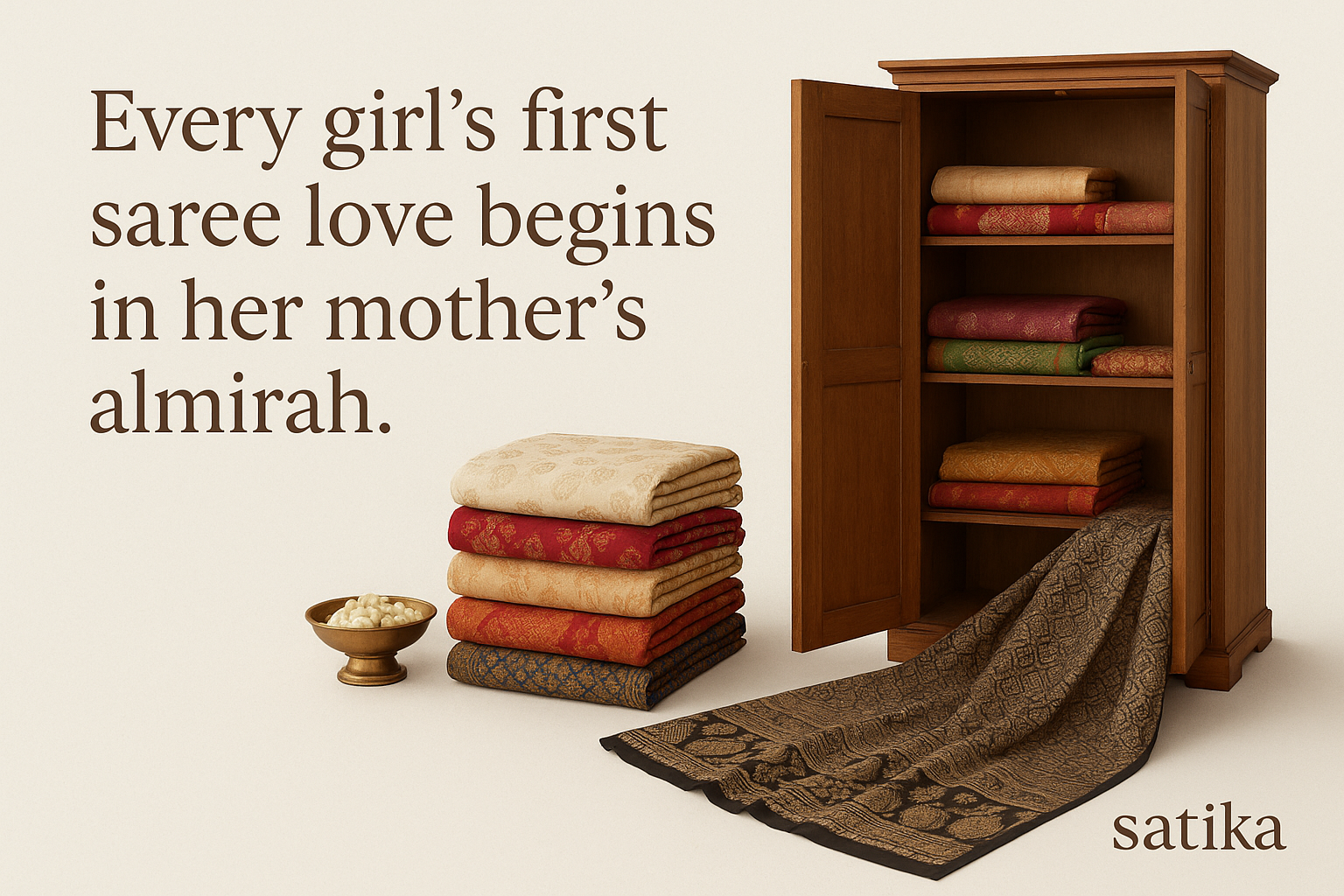 There is a moment in every girl’s life when her eyes discover the quiet magic of a saree. Not in a showroom, not in a boutique—but inside her mother’s old wooden almirah, filled with memories wrapped in six yards of love.