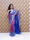 Handwoven Sambalpuri silk saree in rich blue and purple tones, featuring traditional Ikat motifs.